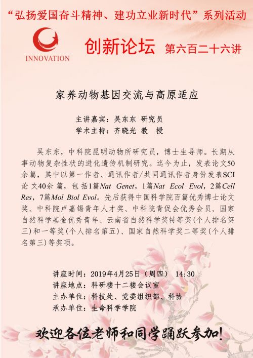 吴东东 乐动平台官网创新论坛第六百二十六讲(“弘扬爱国奋斗精神、建功立业新时代”系列活动):家养动物基因交流与高原适应 讲座时间 2019年4月25日(周四) 14:30 讲座地点 科研楼十二楼会议室 讲座人介绍 吴东东 讲座内容