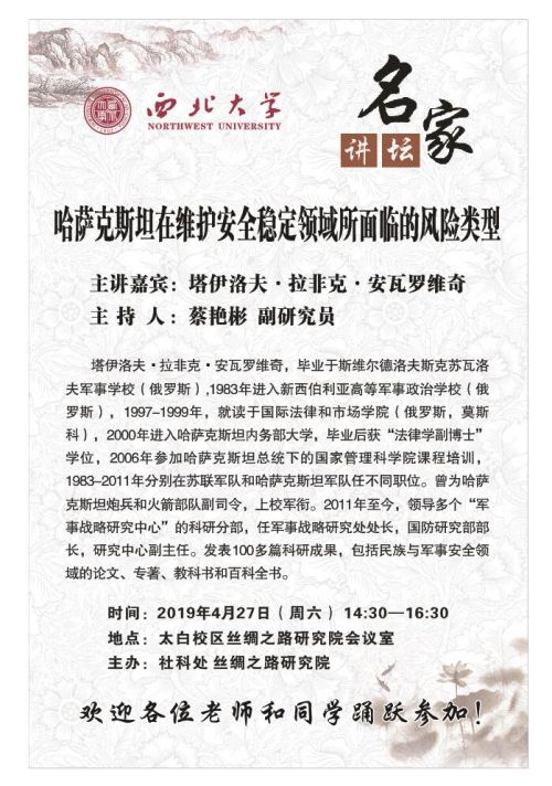 塔伊洛夫·拉非克·安瓦罗维奇 名家讲坛:哈萨克斯坦在维护安全稳定领域所面临的风险类型 讲座时间 2019年4月27日(周六) 14:30—16:30 讲座地点 太白校区丝绸之路研究院会议室 讲座人介绍 塔伊洛夫·拉非克·安瓦罗维奇 讲座内容
