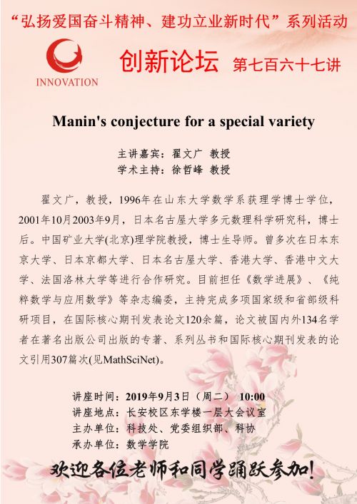 翟文广 乐动平台官网创新论坛第七百六十七讲(“弘扬爱国奋斗精神、建功立业新时代”系列活动):Manin's conjecture for a special variety 讲座时间 2019年9月3日(周二) 10:00 讲座地点 长安校区东学楼一层大会议室 讲座人介绍 翟文广 讲座内容
