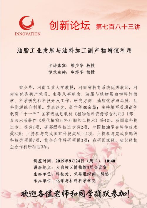 乐动平台官网创新论坛第七百八十三讲:油脂工业发展与油料加工副产物增值利用