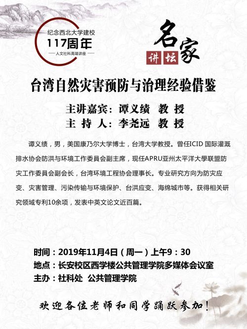 谭义绩 教授 乐动平台官网校庆117周年人文社科高端讲座暨“名家讲坛”:台湾自然灾害预防与治理经验借鉴 讲座时间 2019年11月4日9:30 讲座地点 长安校区西学楼公共管理学院多媒体会议室 讲座人介绍 谭义绩 教授 讲座内容