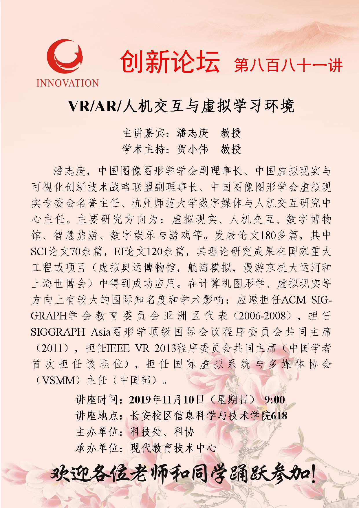 潘志庚 乐动平台官网创新论坛第八百八十一讲:VR/AR/人机交互与虚拟学习环境 讲座时间 2019年11月10日(星期日) 9:00 讲座地点 长安校区信息科学与技术学院618 讲座人介绍 潘志庚 讲座内容