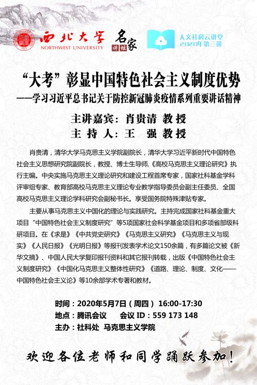 肖贵清 教授 名家讲坛:“大考”彰显中国特色社会主义制度优势——学习习近平总书记关于防控新冠肺炎疫情系列重要讲话精神 讲座时间 2020年5月7日(周四)16:00-17:30 讲座地点 腾讯会议ID:559173148 讲座人介绍 肖贵清 教授 讲座内容