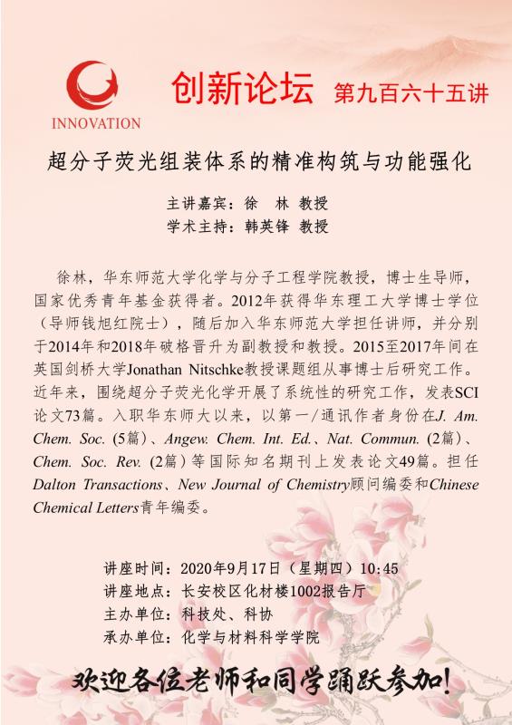 徐林 教授 乐动平台官网创新论坛第九百六十五讲:超分子荧光组装体系的精准构筑与功能强化 讲座时间 2020年9月17日(星期四)10:45 讲座地点 长安校区化材楼1002报告厅 讲座人介绍 徐林 教授 讲座内容