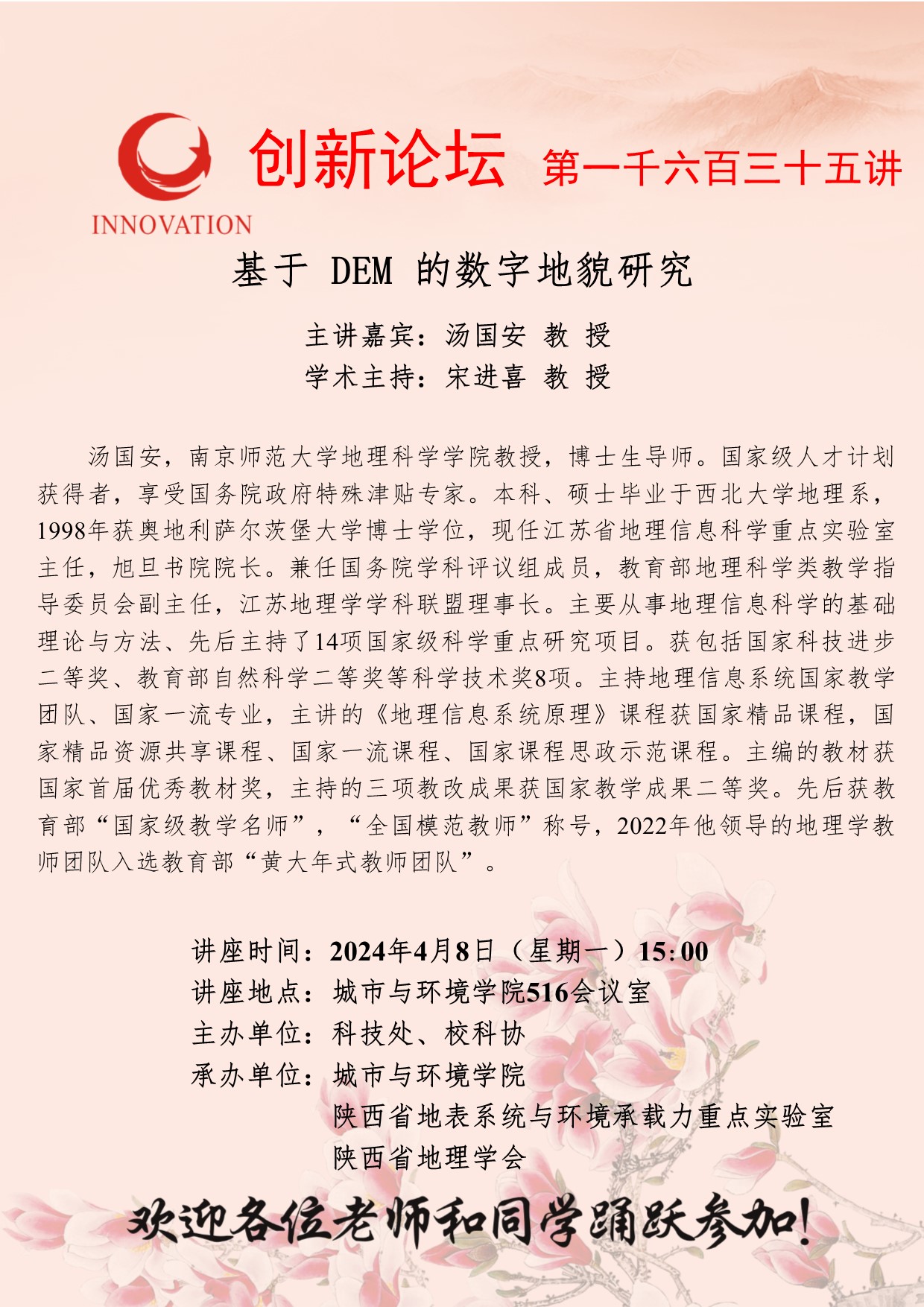 汤国安 教授 乐动平台官网创新论坛第一千六百三十五讲:基于 DEM 的数字地貌研究 讲座时间 2024年4月8日(星期一)15:00 讲座地点 城市与环境学院516会议室 讲座人介绍 汤国安 教授 讲座内容