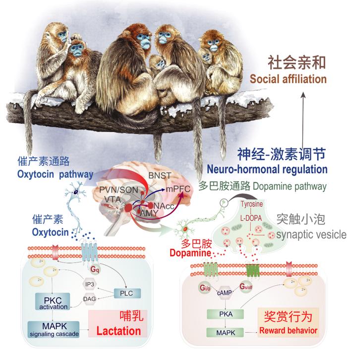 为检验这一假设,研究者们选择了生态行为学、分子和细胞生物学等多个入手点。首先,对不同奇鼻猴的观察数据的量化比较确认了一系列友好行为在一雄多雌、类重层和重层社会中呈递增态势。其次,对催产素、多巴胺通路中的正选择基因的功能验证,为这一差异提供了分子层面的解读。例如,OXTR是重要的催产素受体蛋白,DRD1是多巴胺受体,它们在奇鼻猴类中均有特异的突变。被转入人胚肾细胞后,奇鼻猴类,特别是金丝猴的受体蛋白表现得比一雄多雌的叶猴更为灵敏,与蛋白结构模拟显示的更高配体亲和力相吻合。这暗示以这两种神经递质为代表的神经-内分泌系统的重塑是亚洲叶猴形成更大、更稳定社会的生理基础,为后续研究指明了方向。