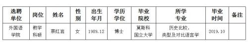 经用人单位推荐,人力资源部审查,学校教学督导及院系相关专家考核,我校拟确定下列人员来校工作。本着公平、公正、公开的原则,现将本次拟选聘人员基本情况公示如下: