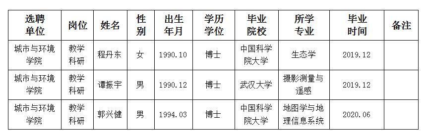 经用人单位推荐,人力资源部审查,学校教学督导及院系相关专家考核,我校拟确定下列人员来校工作。本着公平、公正、公开的原则,现将本次拟选聘人员基本情况公示如下: