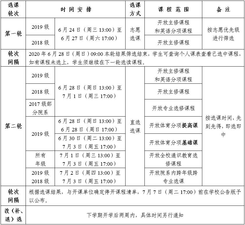 2.课程的改(补、退)选安排在下学期开学后两周内,具体时间另行通知。因课程停开或其他原因在前两轮选课期间未选上课的学生,务必在此阶段完成所有课程的补选。